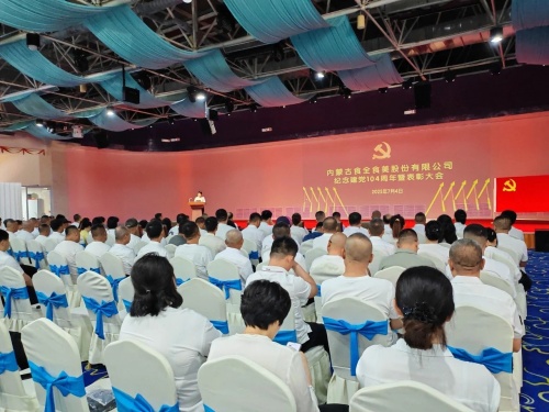 2025/07/07為慶祝中國共產黨成立104周年,激勵公司系統各級黨組織和廣大黨員干部進一步堅定理想信念、勇于擔當奉獻,以更加自覺的行動、更加昂揚的干勁投身于集團公司高質量發展的新征程中,7月4日上午,食全食美集團公司隆重召開慶祝中國共產黨成立104周年暨“七一”表彰大會。集團公司黨政領導班子成員、環節領導干部、全體在職黨員、骨干員工及商戶代表等共計120人參加了本次大會。